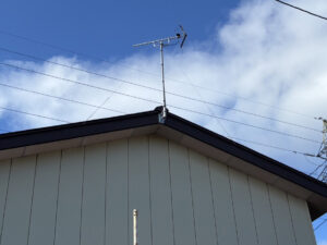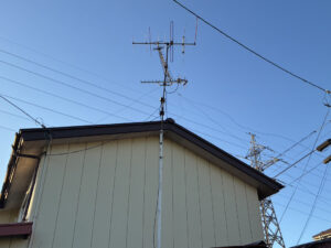今回、和歌山市のお客様宅に到着してまず目に入ったのは、お客様がかつてご自身で設置されたというアンテナの姿でした。設置から長い年月が経過し、固定具の腐食や配線の劣化がかなり進行しており、今にも崩れ落ちそうな状態でした。